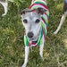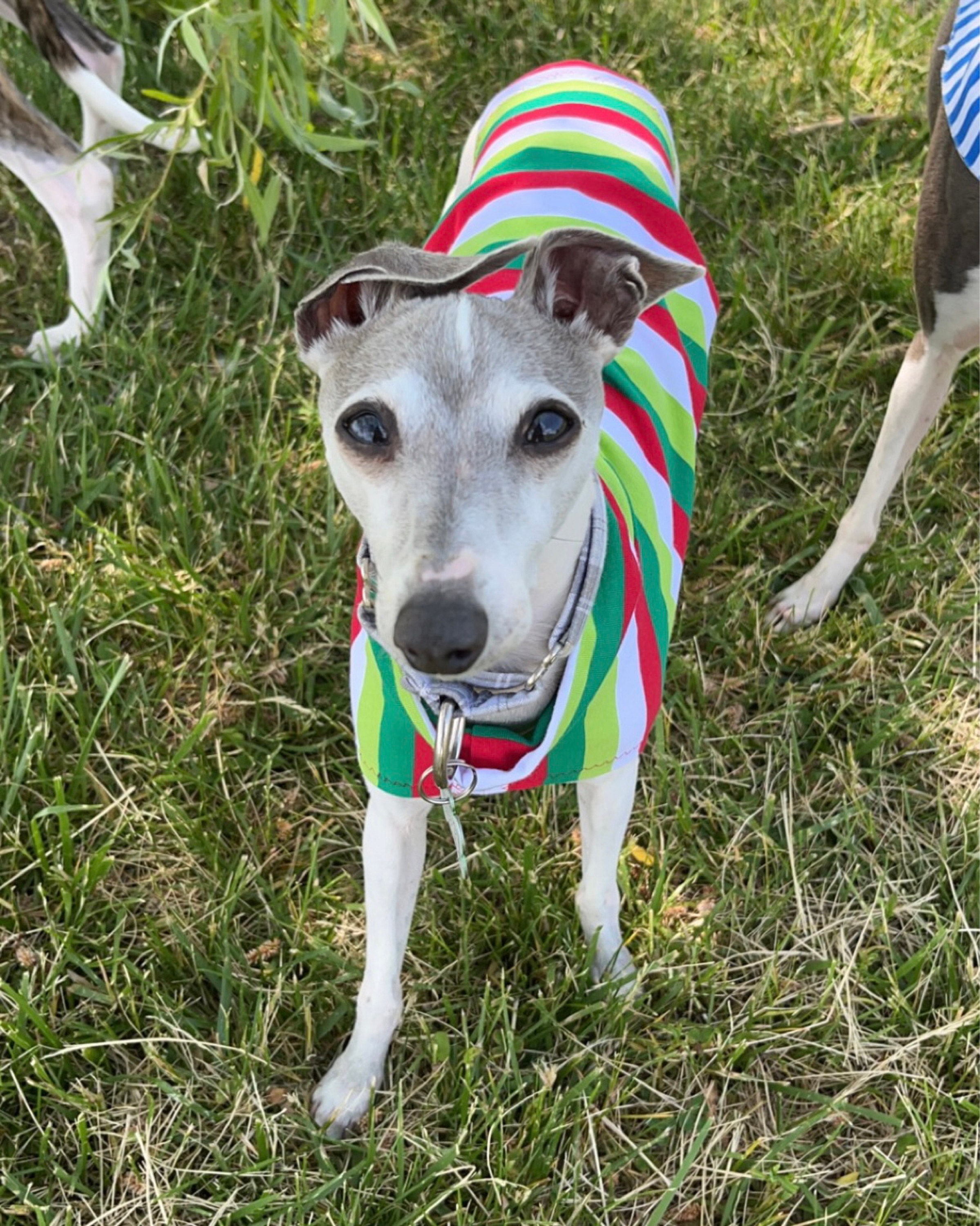 Christmas Stripe Tee in red/green/lime green/white, made of a medium-weight cotton/Lycra blend knit fabric with 4-way stretch for your hound's comfort. This is a festive Tee for holiday parties or for keeping the chill of in an air conditioned home. Darted in all the right places for a sleek fit. The Tee is designed to be a little shorter and does not cover the rear. The trim lines stop around the front of your hound’s thigh. Velcro belly closure for easy on and off (see size chart below).