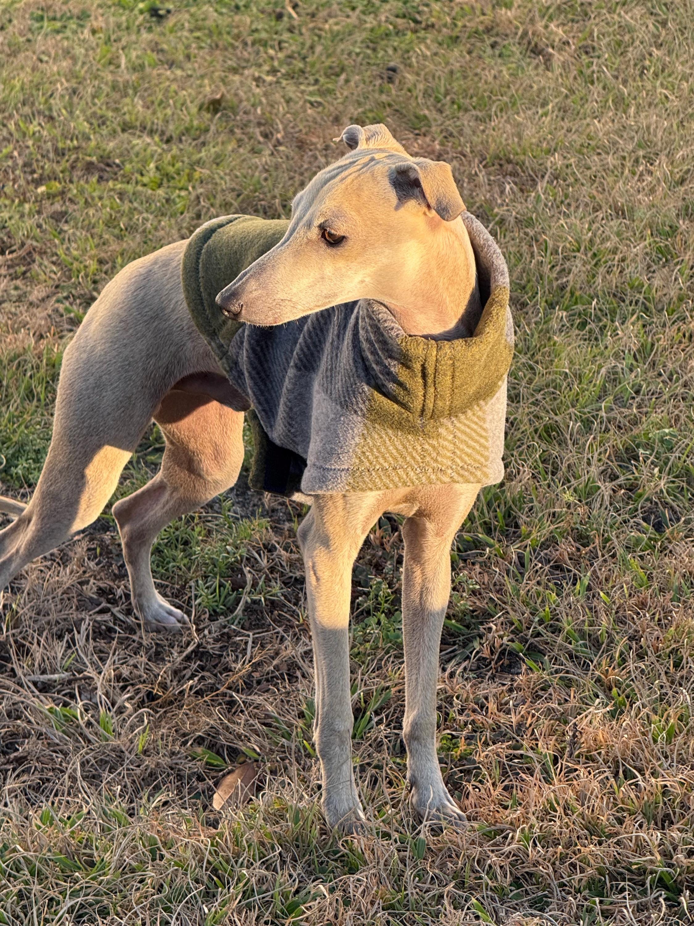Vest is made of Luxe fleece which is softer and heavier than regular fleece. Ideal for extra warmth around the house on a winter’s day. Mock turtle neck. Velcro belly closure for easy on and off. No need to remove for potty breaks. Darted in all the right places for a sleek fit. The Vest style is designed to be a little shorter and does not cover the rear. The trim lines stop around the front of your hound’s thigh.