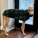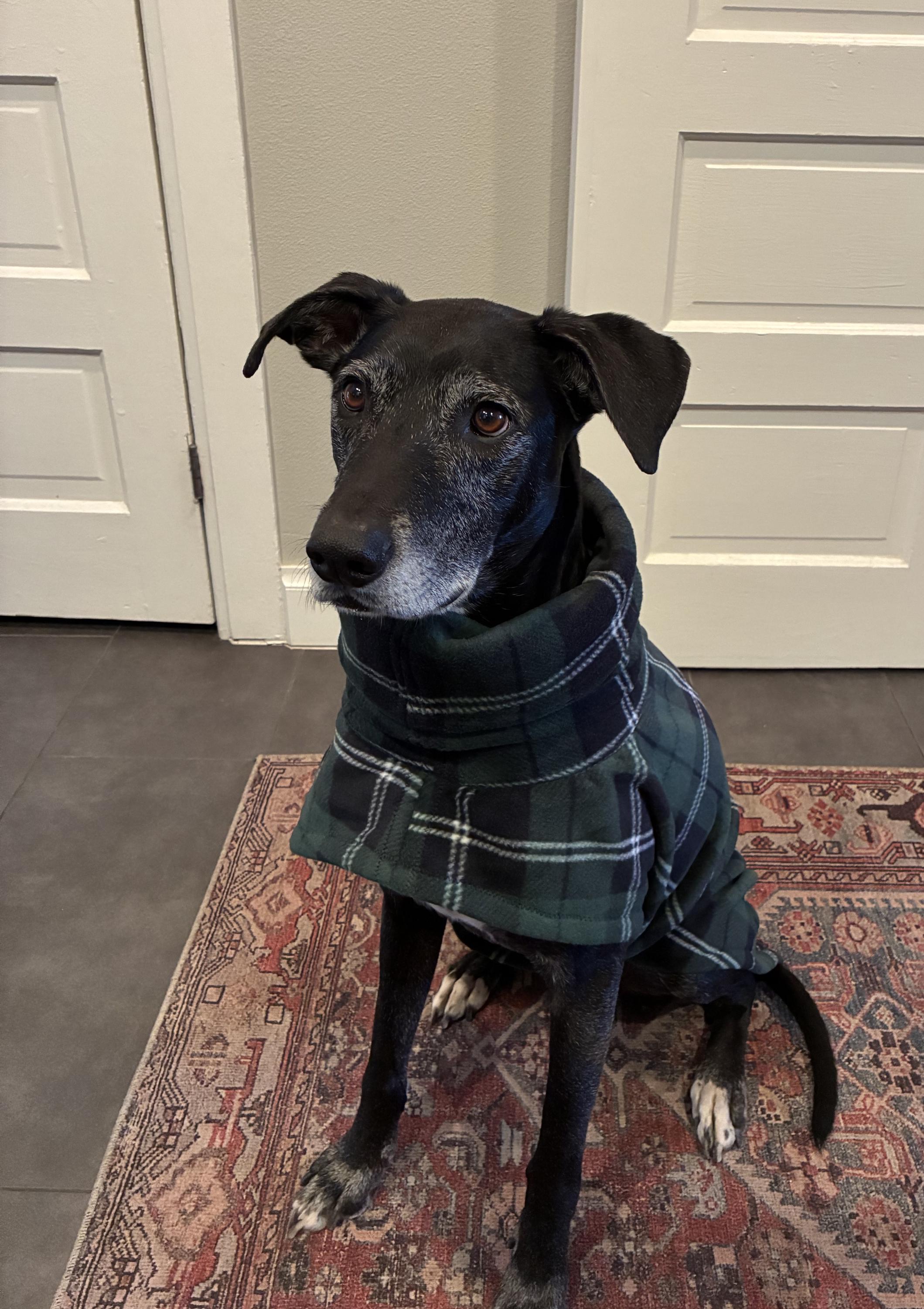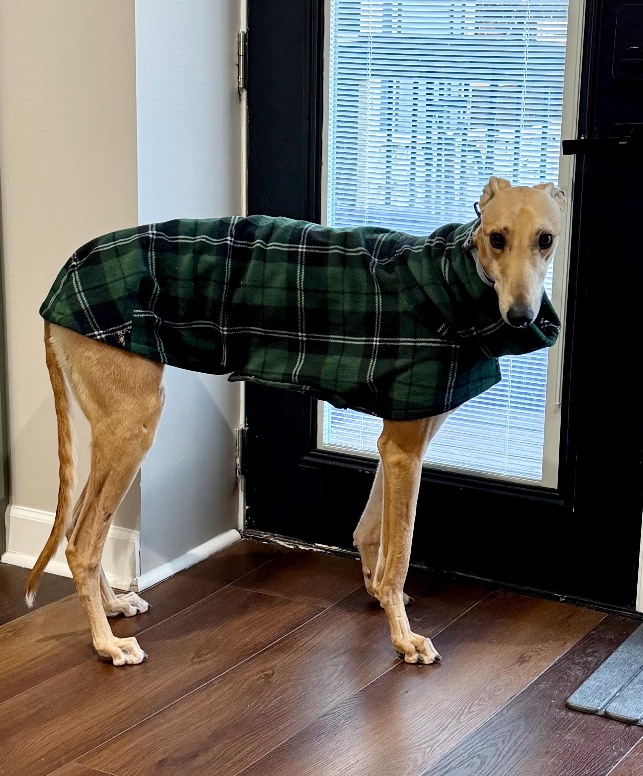 Greyhound Coat. Greyhound Fleece Jacket. Plaid coat for Greyhound with cowl neck collar.