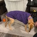Purple & Black Stripe Tee for Greyhound. Made of a medium-weight cotton/Lycra blend knit fabric with 4-way stretch for your hound's comfort. A versatile Tee that can be worn for Halloween, trick-or-treat, parties, or just hanging around the house. Darted in all the right places for a sleek fit. The Tees are designed to be a little shorter and does not cover the rear. The trim lines stop around the front of your hound’s thigh. Velcro belly closure for easy on and off (see size chart below). No need to remove for potty breaks for male or female.