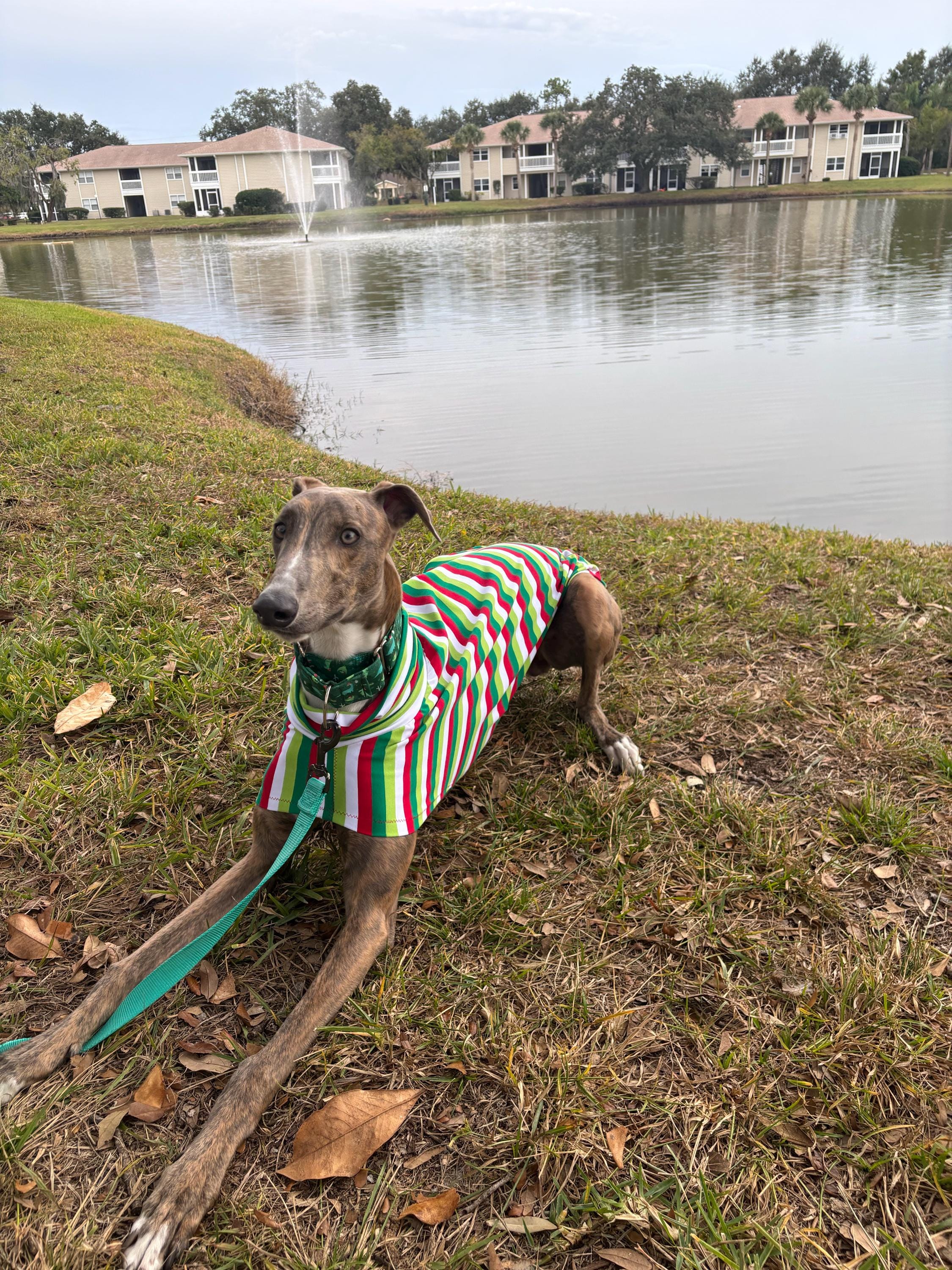 I LOVE this shirt! My girl, Mabel, is going to look so cute on Christmas. The item arrived insanely fast- well under a week from when I ordered it. The package came with a tape measure which will be very handy for when I order more clothes! I wish it came in a smaller size because it is a little baggy on her. I think this would fit the average greyhound perfect, but Mabel is a little peanut. Overall, great shirt, great seller, fast delivery. Would love to see some smaller sizes!