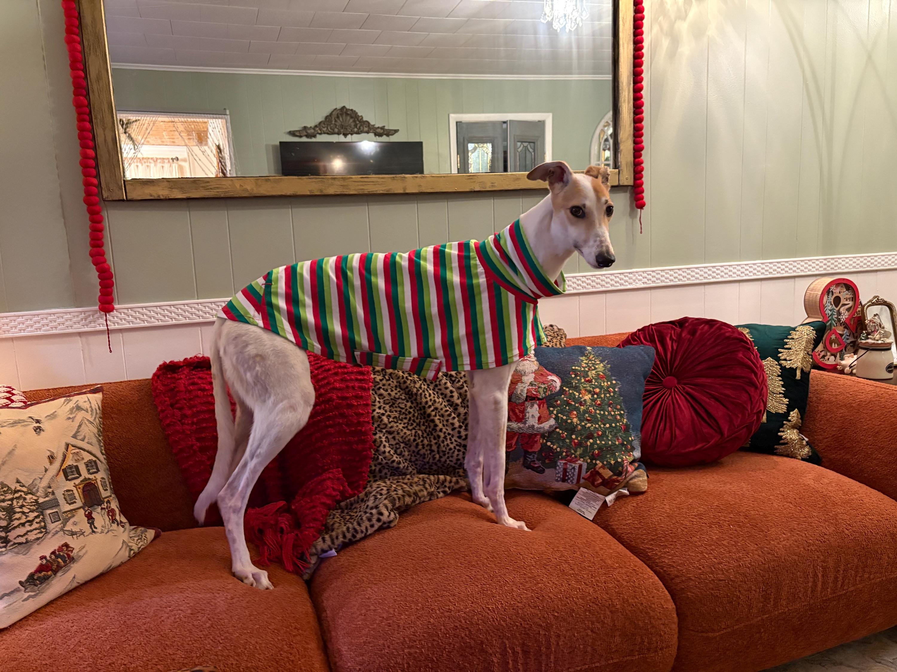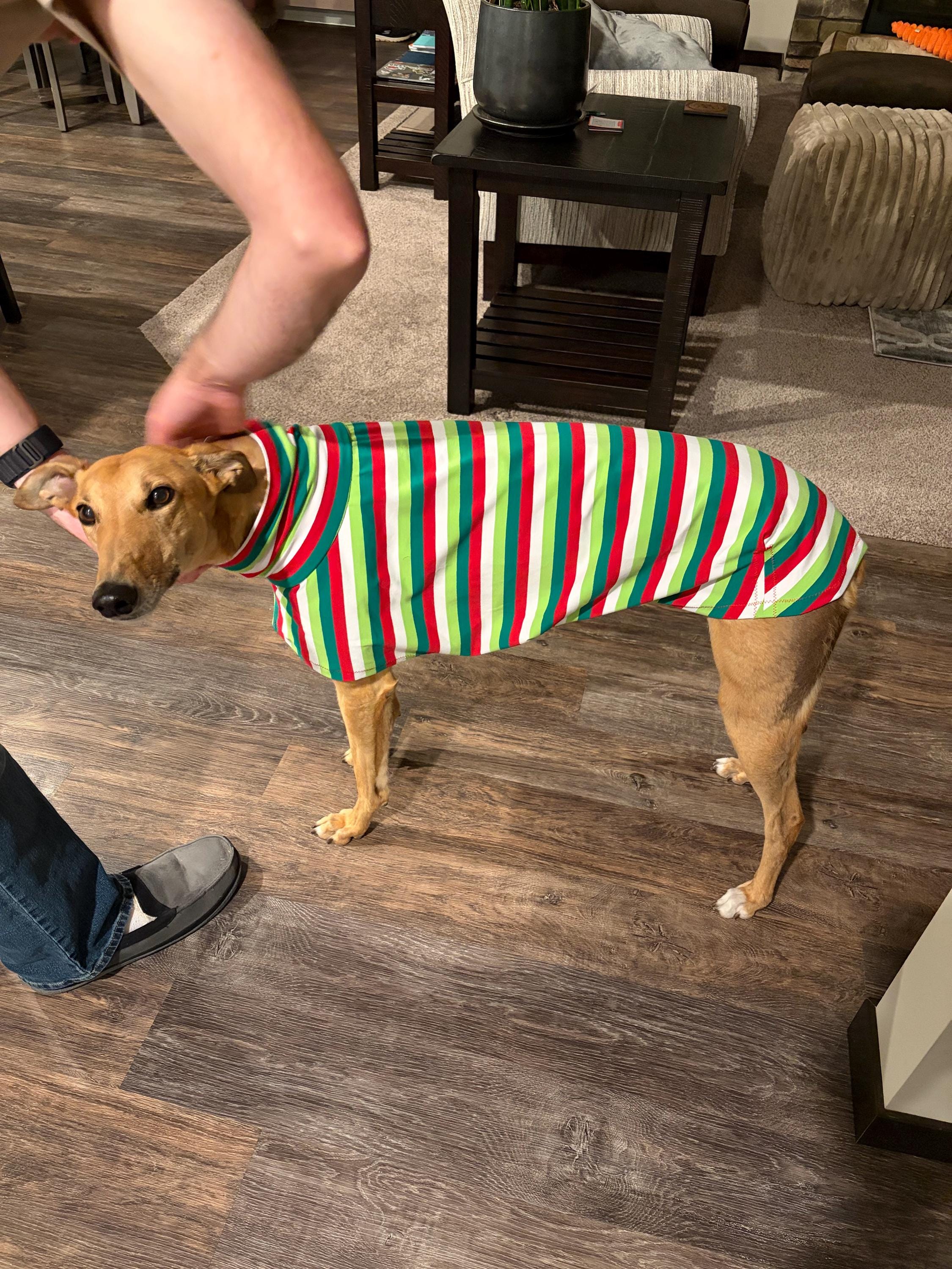 Christmas Stripes Knit Tee for Greyhound. Made of a medium-weight cotton/Lycra blend knit fabric with 4-way stretch for your hound's comfort. A versatile Tee that can be worn for the holidays, parties, or just hanging around the house. Darted in all the right places for a sleek fit. The Tees are designed to be shorter and does not cover the rear. The trim lines stop around the front of your hound’s thigh. Velcro belly closure for easy on and off (see size chart below). No need to remove for potty breaks for male or female.