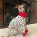 Santa's Little Helper Christmas Pajamas! (Hats shown in photos not included). A soft, light-weight fabric made of 95% cotton/ 5% Spandex for a comfortable fit (has a nice 4-way stretch and will fit looser than the fleece PJs). Sure to be a hit for your holiday season. White background with images of candy canes, snowmen, Santa, deer, & stockings in Red/Green/White. Red cuffs and collar. The belly is open and there is no need to remove for potty breaks for male or female. No fasteners. Sized to fit Italian Greyhounds and small dogs. NOTE: the Length measurement is the most crucial for getting the correct PJ size. If the length of the PJ is too short, they will not fit. This fabric has a nice 4-way stretch. (See size chart below).