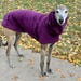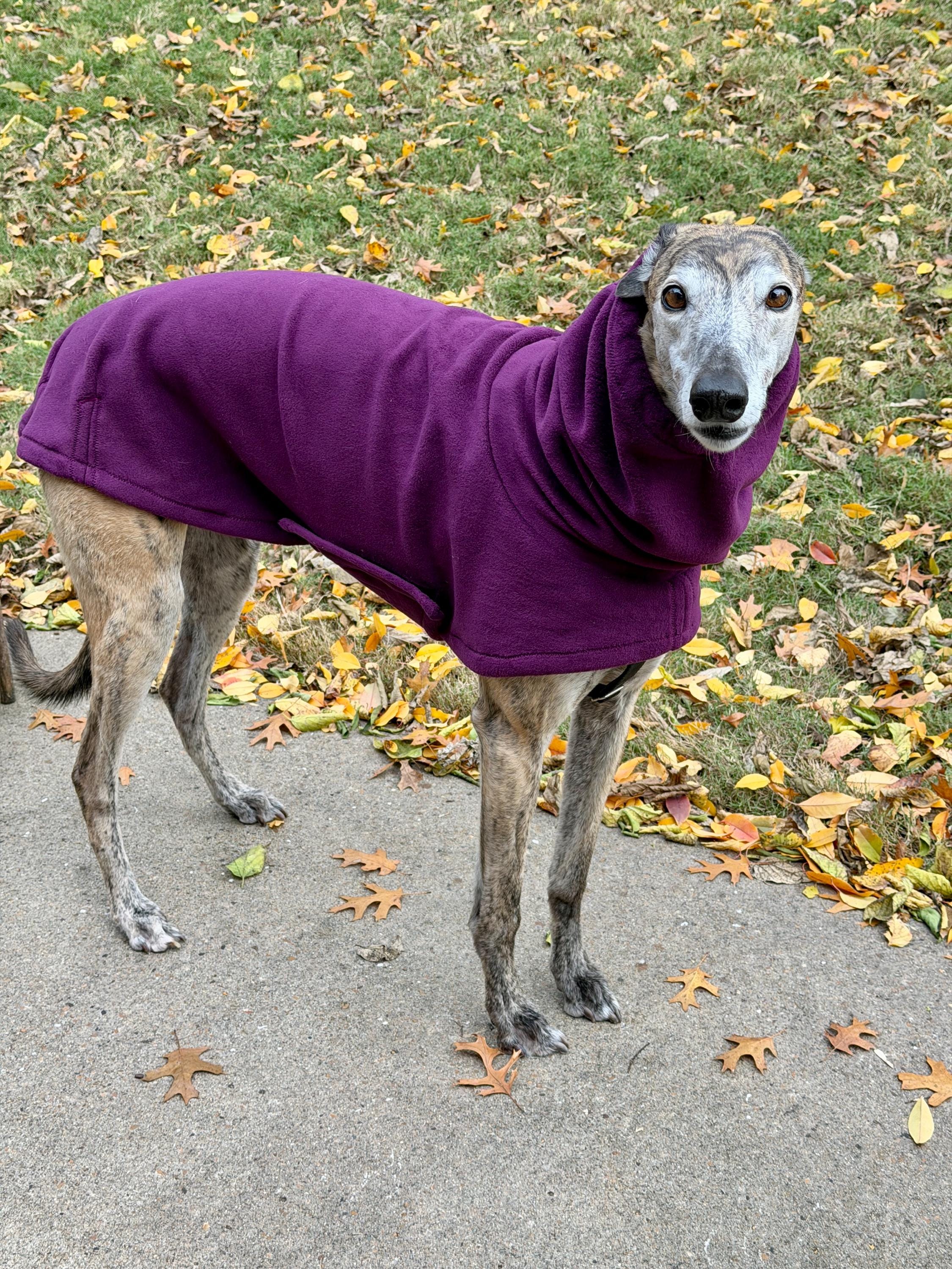 Gorgeous hoodie made of Luxe Fleece which is heavier and more luxurious than regular fleece. A premium quality fabric and oh so soft! A great choice for winter weather. The Plum Passion color is a deep, rich shade of Plum - even husbands won't mind walking the hound in this one, so you can get by with getting a "purple" coat. The hoodie has elastic around the face. Ideal for keeping toasty warm on a winter’s walk. It is designed to fit longer and covers the rear. Adjustable Velcro belly closure - great for layering. Darted in all the right places for a tailored fit. (See size chart below).